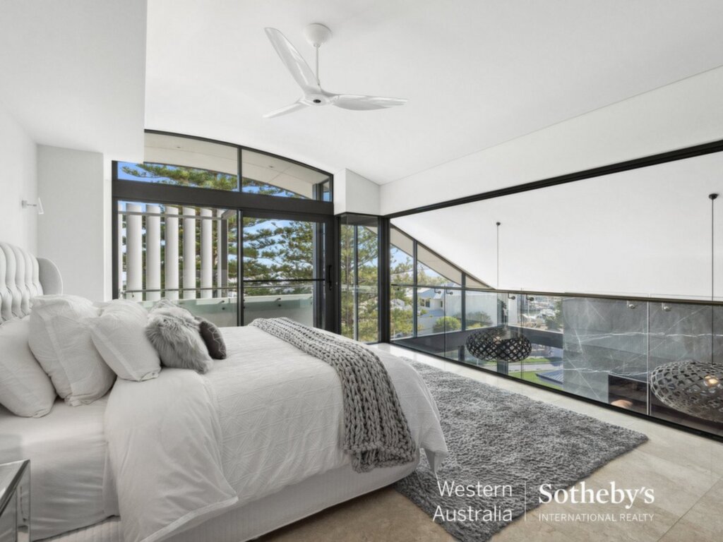 Occupying the top floor, the romantic master suite celebrates coastal luxury in spades with uninterrupted ocean & marina views enjoyed bedside thanks to an open mezzanine floorplan overlooking the living room below and across to endless windows beyond.