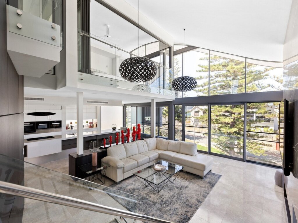 Elevated just over 6-metres above street level and clad entirely in panes of huge glass panels, the home's distinctive exterior is admired for its wave-like aesthetic, intended to meld into the coastal landscape.